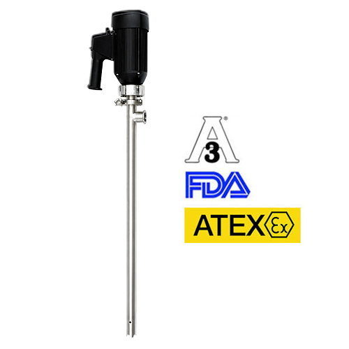 Pompe travaso e svuota fusti del tipo centrifughe senza tenuta in acciaio inox 316 con certificazioni FDA e 3A. Le prestazioni, a seconda dei motori applicati, coprono portate fino a 130 l/min, e prevalenze fino a 22m.
