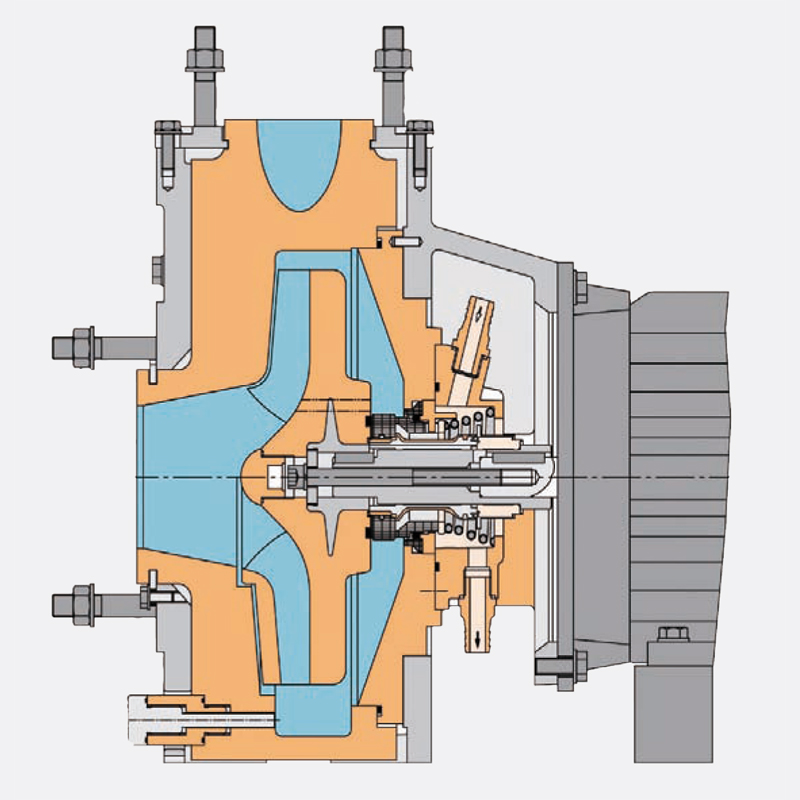• Continuous Flushing System: quando si hanno elevate concentrazioni di solidi e di cristalli, questo tipo di flussaggio agisce direttamente nella zona tenuta, all’interno della pompa idraulica nella zona dietro la girante. Questo tipo di sistema è l’ideale in quelle applicazioni dove è possibile una piccola diluzione del fluido di processo. Questa soluzione può evitare l’utilizzo della tenuta meccanica doppia.