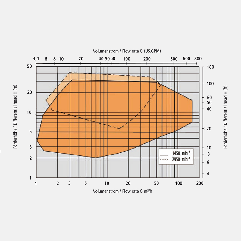 L’asse verticale a contatto con il liquido arriva fino ad una profondità di 1600 mm, e con prolunga di estensione si arriva a coprire una lunghezza d’asse di 3200 mm, e possono essere realizzate, con lunghezza d’asse su richiesta del cliente, per tanto viene realizzata la pompa idonea per ogni esigenza di profondità nell’intervallo fino a 3200 mm.
