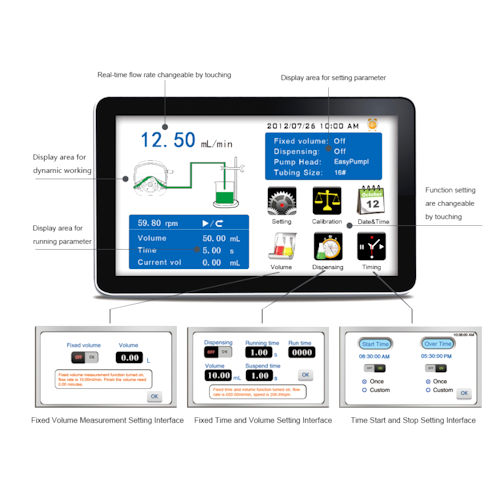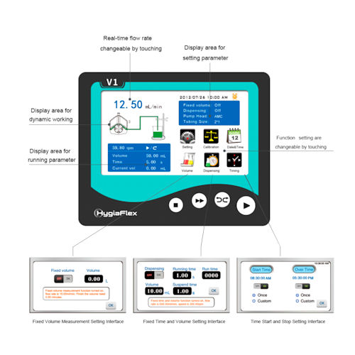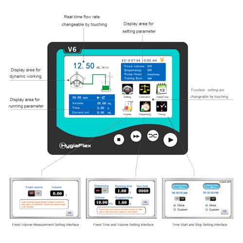 Le pompe peristaltiche Hygiaflex LABV1 / LABV3/LABV6 e V1 / V3 /V6 dispongono di un display a colori da 4,3″ ed hanno tre modalità di misurazione: volume fisso, tempo e volume fissi, avvio e arresto a mezzo timer.
